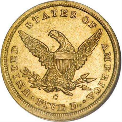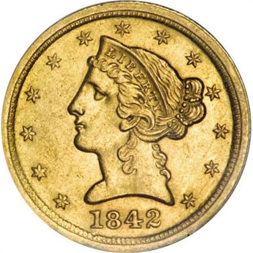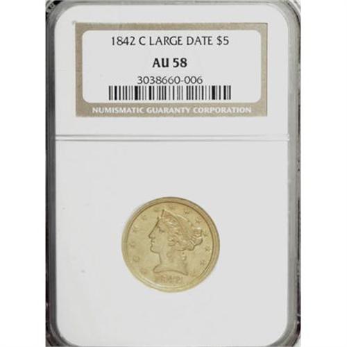 <B>1842-C $5 Large Date AU58 NGC.</B></I> Variety 5-C. A bright, olive-green example with strongly defined design elements, save the bit of rub that defines the grade. The surfaces are cleaner than frequently seen on this issue, with the exception of some scratches in the lower right obverse field and a solitary mark near the eagle's head on the reverse. <BR><BR><B>Coin Engraver:</B> Christian Gobrecht<BR><BR><b>Shipping:</b> Coins & Currency (<a target="_blank" href="http://www.heritageauctions.com/common/shipping.php">view shipping information</a>)