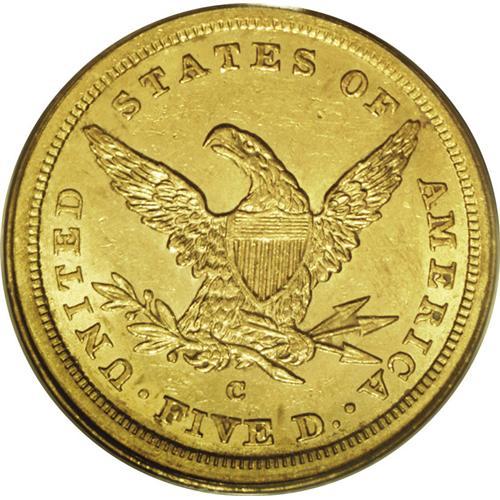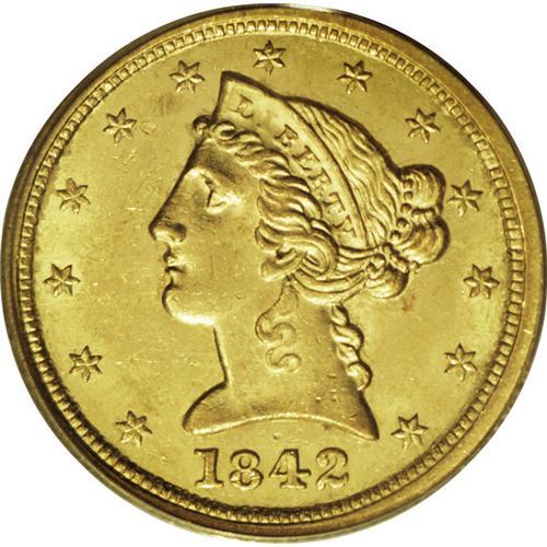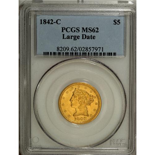 <B>1842-C $5 Large Date MS62 PCGS.</B></I> Variety 5-C. Easily one of the finest examples of this early Charlotte issue. While much more attention is lavished on the exceptionally elusive Small Date variety, the truth is that the more "common" Large Date is itself difficult to find, particularly if one focuses on quality eye appeal. This piece, one of a handful of Mint State examples known today, has an unusually strong strike, with practically full definition on Liberty's hair and the eagle's feathers. The amber-gold surfaces have soft but pleasing luster, and the light, scattered abrasions that account for the grade are well-distributed and do not detract significantly from the overall eye appeal. An uncommon opportunity to own a Mint State example of this tricky issue. Population: 3 in 62, 2 finer (11/06).<BR><BR><b>Shipping:</b> Coin/Currency (<a target="_blank" href="http://www.heritageauctions.com/common/shipping.php">view shipping information</a>)