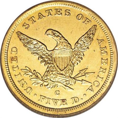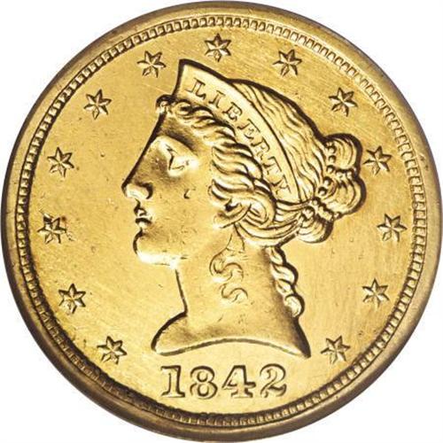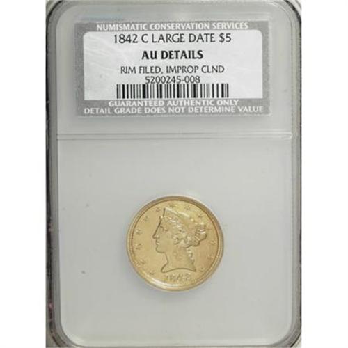 <B>1842-C $5 Large Date--Rim Filed, Improperly Cleaned--NCS. AU Details.</B></I> Variety 5-C. This coin has an excellent naked-eye appearance with the sharpness and detail of Mint State but it has been noticeably cleaned on the obverse and reverse. There is also evidence of rim filing on the obverse at 7 o'clock. An affordable example of this scarce Charlotte five.<BR><I>From The Carolina Circle Collection.</B></I><BR><BR><B>Coin Engraver:</B> Christian Gobrecht<BR><BR><b>Shipping:</b> Coins & Currency (<a target="_blank" href="http://www.heritageauctions.com/common/shipping.php">view shipping information</a>)