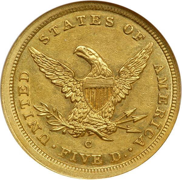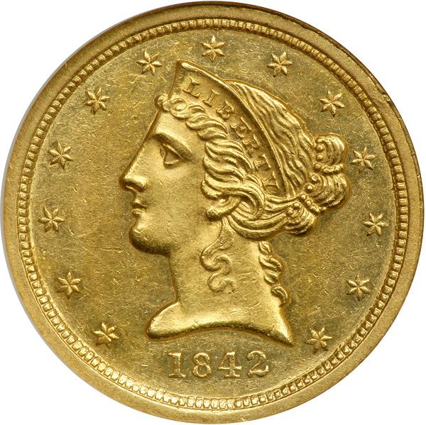 1842-C $5 Liberty. Small date. NGC graded MS-61. In NGC holder 1706409-001. An unusually well struck example with needle sharp details and nice high rims. The lustrous surfaces are slightly reflective while the fields are remarkably clean for this grade. A few very minor ticks are noted on the outer rims, none of which are significent. A major rarity in the Charlotte series and many times rarer than the Large Date variety.