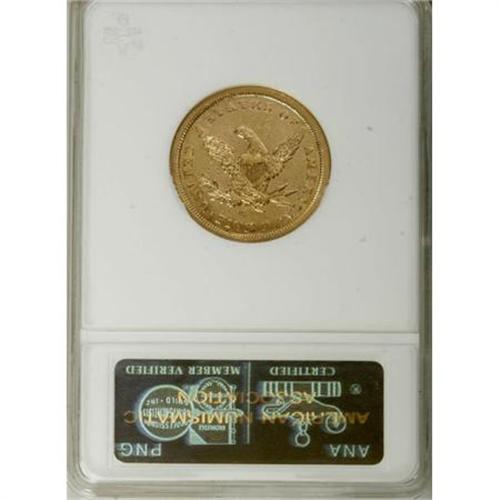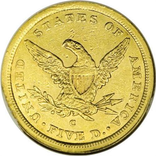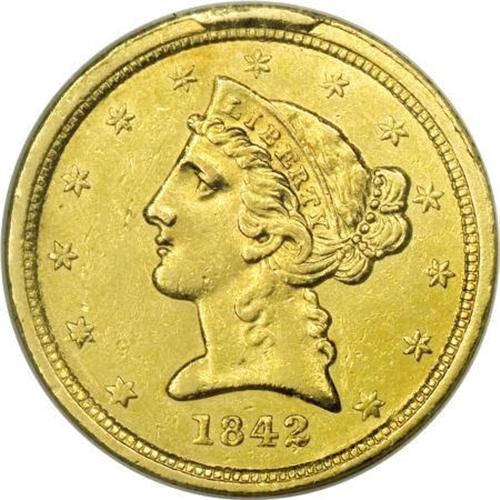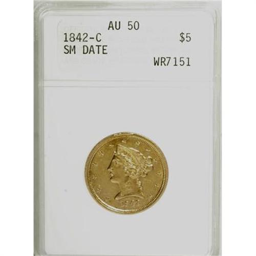 <B>1842-C $5 Small Date AU50 ANACS.</B></I> Variety 4-C. Die State II with a massive obverse die cud at 12:00. The obverse is relatively well detailed except for stars 1 and 13, which are flat; the reverse is weak on the neck feathers while the rest of the detail is sharp. There are some minor marks in the fields including a few sharp ticks near Liberty's nose and signs of a light, old cleaning but this piece clearly appears to be gradable at PCGS or NGC. There is luster seen on both sides and it is consistent with the AU grade assigned by ANACS. The color is a nice light yellow-gold with some reddish-gold overtones. This is a genuinely attractive example of this rarity and it would be a welcome addition to a high quality set of Charlotte half eagles.<BR> Although the 1842-C Small Date half eagle has lost a bit of its luster in recent years, it remains the single rarest coin ever produced at this mint. There are an estimated five to six dozen pieces known with most in the VF-XF range. There are as many as 10 to 12 coins in AU, as well as two Mint State coins.<BR><I>From The Carolina Circle Collection.</B></I><BR><BR><B>Coin Engraver:</B> Christian Gobrecht<BR><BR><b>Shipping:</b> Coins & Currency (<a target="_blank" href="http://www.heritageauctions.com/common/shipping.php">view shipping information</a>)