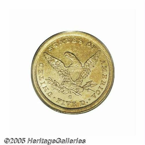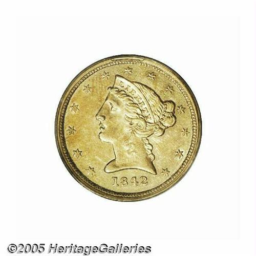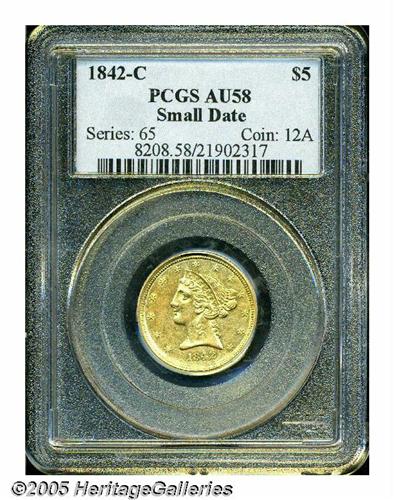 <B>1842-C<$5> Small Date AU58 PCGS.</B></I> Variety 4-C, the only known dies. Die State II. The two die states of this variety are easily distinguished by the presence or absence of a rim break at the top of the obverse, over star 7. Examples with the rim break are more prevalent, although both die states are rare, especially in such fine condition. Walter Breen recorded historical notes about the 1842 Charlotte Mint coinage. Only 4,595 examples of the Small Date variety were produced, while 23,589 of the large date were coined. The obverse die broke on March 22, according to Breen.<BR> Very few examples of this variety have been certified, perhaps because few exist! This is unusually sharply struck with only slight weakness on the eagle's neck feathers. The surfaces are mildly reflective with brilliant yellow luster. Minor abrasions are visible on both sides. Although PCGS and NGC have combined to certify nine examples in MS60 or better grades, we believe that only three or four such pieces exist. This is the second rarest Charlotte-Mint issue behind the virtually unobtainable 1849-C Open Wreath Gold Dollar.