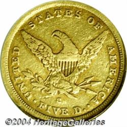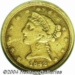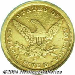 <B>1842-C<$5> Small Date VF20 Details, Damaged, NCS.</B></I> Variety 4-C. According to Douglas Winter, "the 1842-C Small Date is the rarest Charlotte half eagle. It is also the second rarest Charlotte coin, trailing the excessively rare 1849-C Open Wreath gold dollar." An early die stage without the obverse die break at 12 o'clock. This polished and typically struck example has a faint bend and a pair of Xs pinscratched into the right obverse field. A scratch affects the left obverse and crosses Liberty's jaw. A lesser horizontal scratch affects the eagle's shield. An affordable representative of this key Charlotte variety that can be upgraded upon eventual completion of a specialized holding. <BR><BR><B>Important notice:</B> Heritage usually auctions material at the rate of 200-250 lots per hour. On some occasions eBay Live bid software or the Internet may not be able to keep up with the pace of the auction. We recommend placing a realistic absentee bid now as insurance to avoid disappointment. Occasionally the auctioneer may eliminate or reject an eBay Live bid, and the auctioneer may also reopen a lot after the close of the eBay live bidding (usually because we missed an audience bid), and may reject your bid even if it shows you as the winning bidder. By bidding via eBay Live, you agree that Heritage may award the lot to another bidder at its sole discretion under the circumstances described above or any other reasonable circumstances. Since eBay bids are not shown to us until we open the lot on the floor, we treat those bids just like floor bids. In most cases the floor responds before the eBay bid is presented to us, due to Internet lag time, so for consistency we have made it a policy that floor bids are always considered first over tie eBay live bids. Also please note that all Heritage lots purchased through eBay Live carry a 20% Buyer's Premium. Please make sure you read the Terms and Conditions before you bid. </span></font></tr></table></td></tr></table>