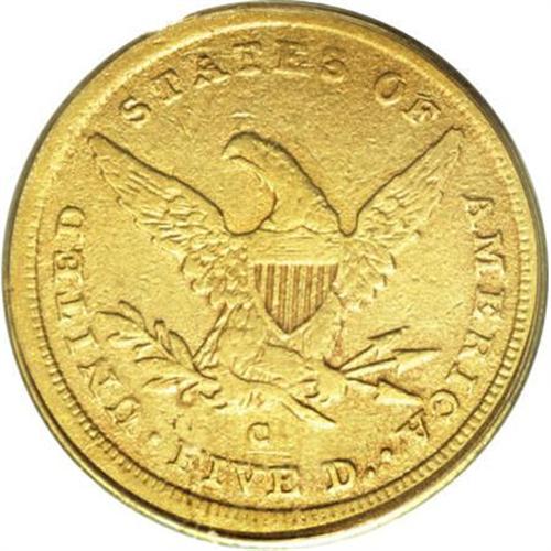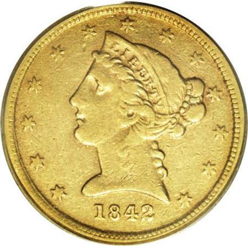 <B>1842-C $5 Small Date VF25 PCGS.</B></I> Variety 4-C. The Small Date '42-C has the lowest mintage of any Charlotte half eagle, and it is also the rarest. It is the second-rarest of all Charlotte coins, second only to the legendary 1849-C Open Wreath gold dollar. Only 35-40 pieces are believed extant out of the estimated 4,595 coins struck. This is an early die state, showing none of the die break or rim cud that later developed after the obverse die broke. The surfaces are somewhat granular and porous. Good obverse details with slight softness on the reverse and showing light reddish patina around the devices on each side. Of the greatest importance to any serious collector of this series. <BR><BR><B>Coin Engraver:</B> Christian Gobrecht<BR><BR><b>Shipping:</b> Coins & Currency (<a target="_blank" href="http://www.heritageauctions.com/common/shipping.php">view shipping information</a>)