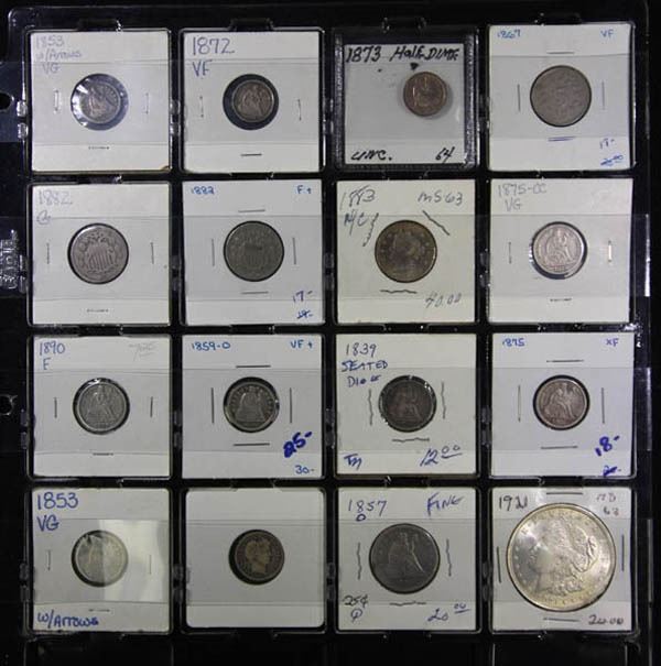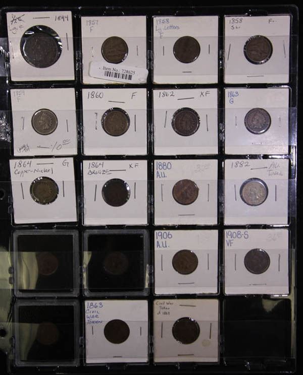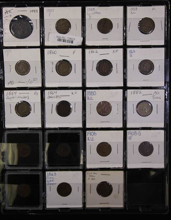 1839-1921, coin & token assortment. Comprising of 35 items in total, we noted: Large 1 1844 F-VF; Flying Eagle 1 1857-8, VG, three pieces; Indian 1 1859/1909 Good to AU, including 1908-S Fine, 13 pieces in total; Civil War Tokens 2; Seated dimes VG-AU three pieces; Shield nickels G-F three pieces; 1883 Liberty nickel no-cents, UNC; seated Liberty dimes, VG-VF, six pieces, 1916 Barber dime, Good; 1857-O Seated Liberty quarter, Fine, 1921 Morgan silver 1, UNC PCGS # 1839 .