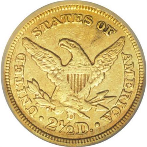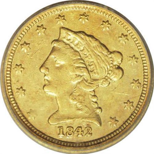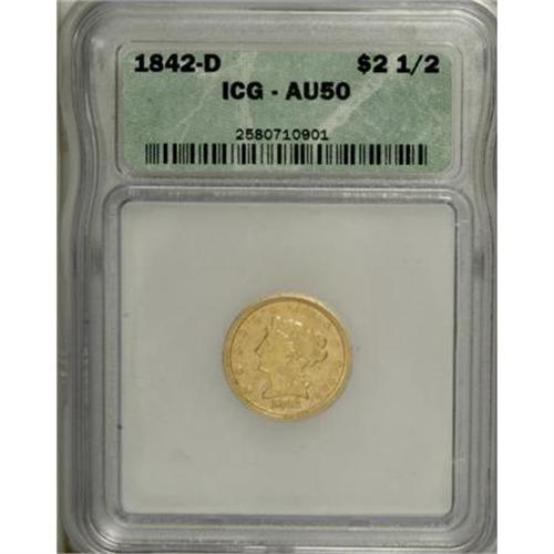 <B>1842-D $2 1/2 AU50 ICG.</B></I> Variety 3-F. The date is clearly repunched south. With a mintage of 4,643 pieces, this is one of the less available Dahlonega quarter eagles, particularly in Mint State. This lightly worn piece has the usual striking weakness on Liberty's brow and the eagle's legs. Minor marks are present on the left obverse, and the field beneath OF is granular.<BR><BR><B>Coin Engraver:</B> Christian Gobrecht<BR><BR><b>Shipping:</b> Coins & Currency (<a target="_blank" href="http://www.heritageauctions.com/common/shipping.php">view shipping information</a>\)