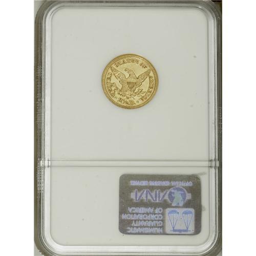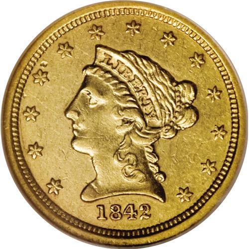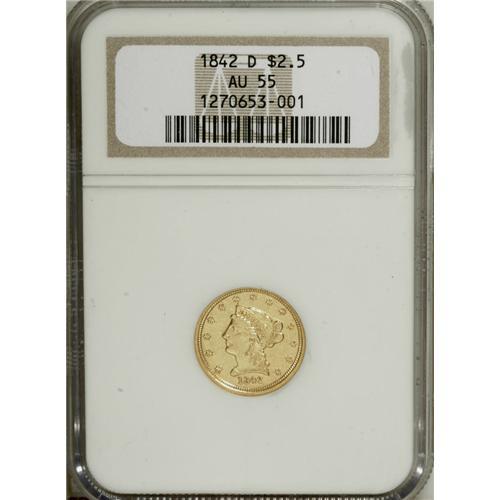 <B>1842-D $2 1/2 AU55 NGC.</B></I> Variety 3-F. The 1842-D quarter eagle is widely acknowledged as one of the most difficult pieces of Dahlonega gold to acquire. Of the original mintage of 4,643 pieces, it is estimated by Winter that only 75 to 85 exist in all grades, with About Uncirculated examples a small fraction of that. Although NGC records five Mint State examples, PCGS has graded none, and it is impossible to know exactly how many of those pieces represent resubmissions. On this Choice AU piece, the wheat-gold surfaces retain soft but significant peripheral luster. The devices, which have minor but distinct wear and a handful of long, thin abrasions, possess above-average detail nonetheless. A handful of flaws and handling marks affect the fields as well. Still, this is an important opportunity to acquire a high-grade circulated example of this often-elusive issue. Census: 7 in 55, 13 finer (4/07).<BR><BR><b>Shipping:</b> Coins & Currency (<a target="_blank" href="http://www.heritageauctions.com/common/shipping.php">view shipping information</a>)