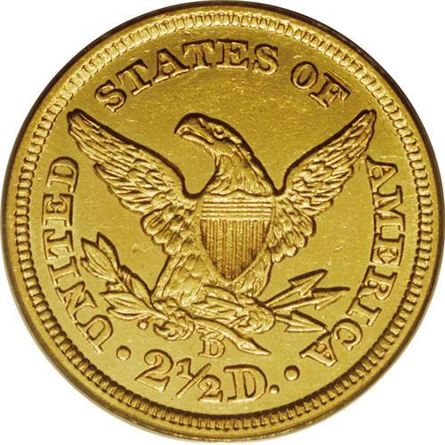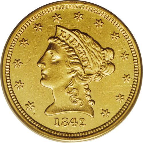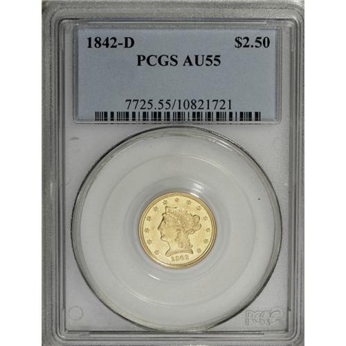 <B>1842-D $2 1/2 AU55 PCGS.</B></I> Variety 3-F. Only one variety is known for this issue from a modest mintage of just 4,643 coins. It is believed that less than 100 examples of the '42-D quarter eagle survive today, and nearly all of those show considerable signs of circulation, and are usually impaired or damaged. Choice AU or Mint State examples of this date are elusive and rank among the hardest to locate in the entire series of Dahlonega Mint quarter eagles. This piece is sharply detailed with reflective surfaces and bright green-gold color. A few faint hairlines should be of little or no concern to the specialist who may want to consider acquisition of this coin. Population: 7 in 55, 4 finer (1/07).<BR><BR><b>Shipping:</b> Coins & Currency (<a target="_blank" href="http://www.heritageauctions.com/common/shipping.php">view shipping information</a>)