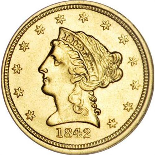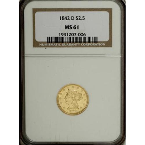 <B>1842-D $2 1/2 MS61 NGC.</B></I> Variety 3-F. Only one die marriage is known for the issue, hardly a surprise since a mere 4,643 pieces were struck. This example was an early emission from the dies, since repunching is apparent beneath the bases of the 18 in the date. The strike is pleasantly sharp, with only unimportant softness noted on the shield lines and the curl beneath the ear. Minor, shallow, and mint-made planchet flaws are present near star 12, above the eagle's left (facing) shoulder and head, and beside the R in AMERICA. The borders display bright cartwheel luster, while the fields are mildly prooflike. The surfaces are remarkably free of identifiable marks. Census: 4 in 61, 1 finer (1/08).<BR><BR><B>Coin Engraver:</B> Christian Gobrecht<BR><BR><b>Shipping:</b> Coins & Currency (<a target="_blank" href="http://www.heritageauctions.com/common/shipping.php">view shipping information</a>)