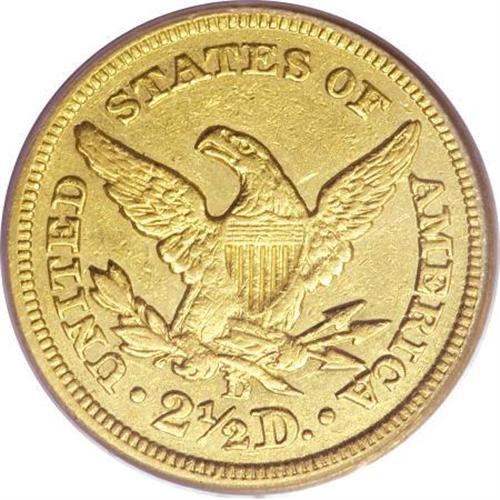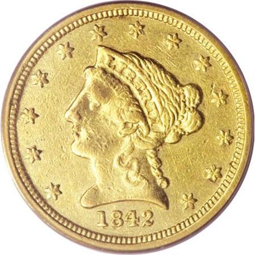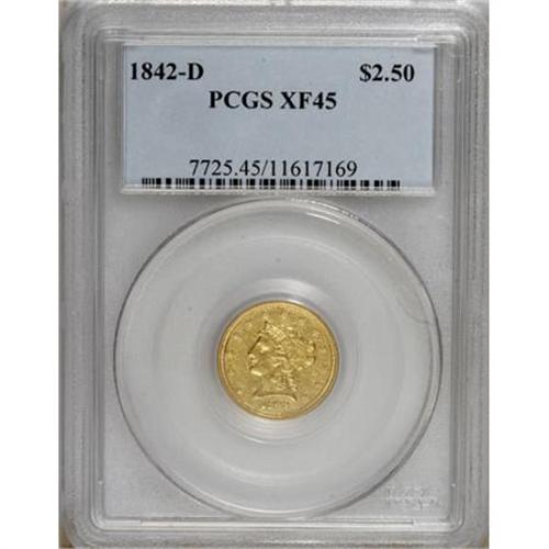<B>1842-D $2 1/2 XF45 PCGS.</B></I> Variety 3-F. The 184 in the date is widely repunched south, diagnostic for this rare issue. Only 4,643 pieces were struck, and perhaps no more than 200 pieces have survived in all grades. This moderately abraded and slightly bright example has a bold strike across the stars and denticles, while the major devices display localized softness. Population: 12 in 45, 19 finer (5/07).<BR><BR><b>Shipping:</b> Coins & Currency (<a target="_blank" href="http://www.heritageauctions.com/common/shipping.php">view shipping information</a>)