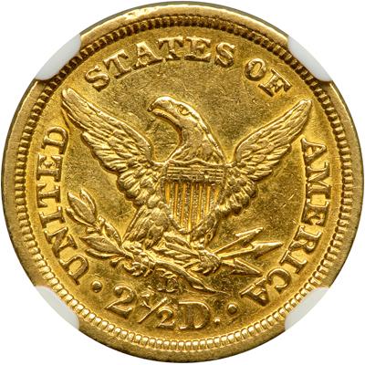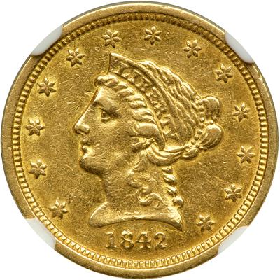 1842-D $2.50 Liberty. NGC graded AU-53. In a new 4 pronged NGC holder. Well struck on slightly marbeled surfaces and untoned. All details nice and strong. Only 4,643 minted. Lustrous light yellow gold. Excellently struck -- notably so -- including far more details than average (but not needle sharp) definition on the eagle's neck and shield. A highly important variety. Only a few reported in Mint condition.