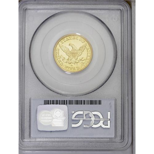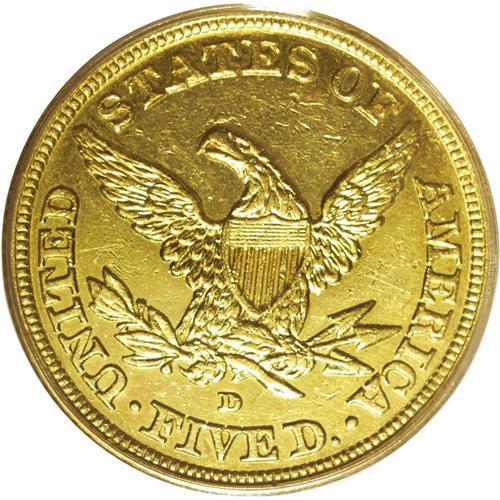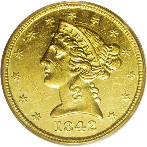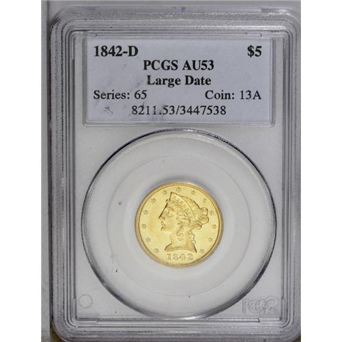 <B>1842-D<$5> Large Date AU53 PCGS.</B></I> Variety 9-G. Although the two half eagle varieties of this year are known as the Large and Small Dates, the reverse mintmarks and other reverse die details differ as well. The Large Date, which also has large letters on the reverse, is much more difficult in higher grades than the Small Date. This lovely example has lustrous yellow-gold surfaces that are strictly original. Despite the Winters reference's admonition that "most examples are extremely heavily abraded and have a 'choppy appearance," this piece has only a few moderate abrasions, far fewer than expected. A couple of light scrapes on Liberty's cheek, visible with a loupe, must be mentioned. The strike is bold and generous, with light weakness only on the fletchings and the right (facing) eagle's claw. This example should generate some serious and spirited bidding, as specimens of this quality appear seldom in today's marketplace--and when they do, the strong hands that acquire them are likely to keep them off the market for many years to come. PCGS has graded four coins finer (3/06). <BR><BR><B>Important notice:</B> Heritage usually auctions material at the rate of 200-250 lots per hour. On some occasions eBay Live bid software or the Internet may not be able to keep up with the pace of the auction. We recommend placing a realistic absentee bid now as insurance to avoid disappointment. Occasionally the auctioneer may eliminate or reject an eBay Live bid, and the auctioneer may also reopen a lot after the close of the eBay live bidding (usually because we missed an audience bid), and may reject your bid even if it shows you as the winning bidder. By bidding via eBay Live, you agree that Heritage may award the lot to another bidder at its sole discretion under the circumstances described above or any other reasonable circumstances. Since eBay bids are not shown to us until we open the lot on the floor, we treat those bids just like floor bids. In most cases the floor responds before the eBay bid is presented to us, due to Internet lag time, so for consistency we have made it a policy that floor bids are always considered first over tie eBay live bids. Also please note that all Heritage lots purchased through eBay Live carry a 20% Buyer's Premium. Please make sure you read the Terms and Conditions before you bid. This lot is being auctioned in conjunction with a live floor auction by Heritage Galleries & Auctioneers. All final auction and invoice information will be supplied by Heritage Galleries & Auctioneers, and all other information should be considered preliminary. Lot:2664 <BR><BR><B>Winning Notification and Billing:</B> After the FINAL session in this auction is complete, Heritage will send e-mail and snail mail invoices. This process normally takes several days. All final auction and invoice information will be supplied by Heritage Galleries & Auctioneers, and all other information should be considered preliminary. <BR><BR>This auction will be conducted on a live auction floor and over the Internet through eBay Live. If you choose to place an absentee bid, please take a moment to <font color='#0000ff'><u><a href='http://pages.ebay.com/liveauctions/help/before/laabsentee.html'>learn how eBay Live absentee bidding works</a></u></font><font color='#000000'>