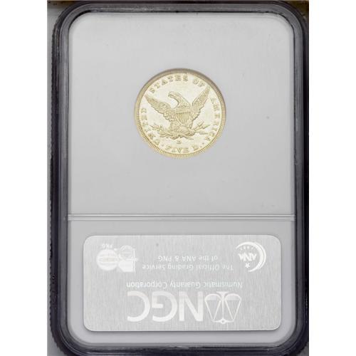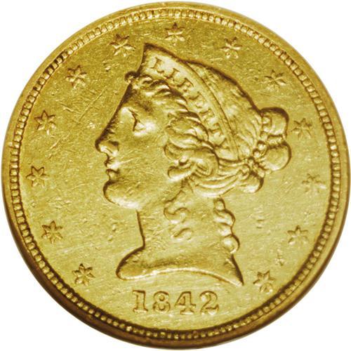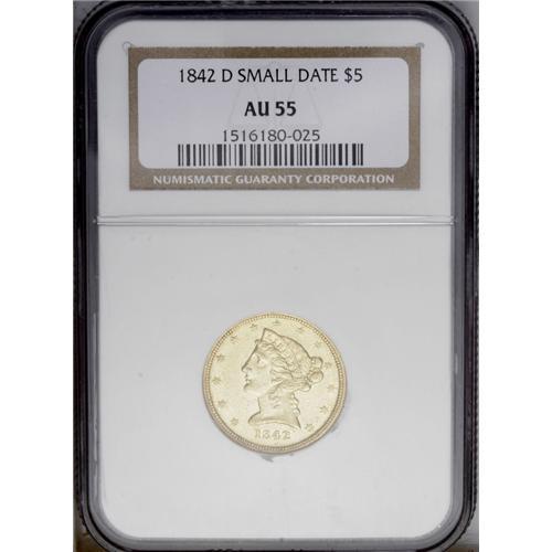 <B>1842-D<$5> Small Date AU55 NGC.</B></I> Variety 8-E. The 1842-D Small Date is relatively common in terms of its overall rarity, but the vast majority grade VF and XF. The issue is very scarce in lower AU, and rare in the upper range of this grade.<BR> The Choice AU55 specimen presented in the current lot exhibits bright yellow-gold surfaces with considerable residual luster in the recessed areas. The design elements reveal nice definition, except for the usual softness in the hair curls around Liberty's ear. A few minute contact marks are scattered about, but the surfaces are not as heavily abraded as typically occurs on representatives of this issue.