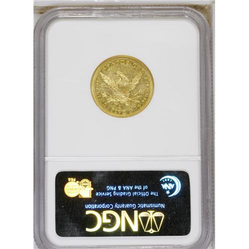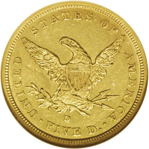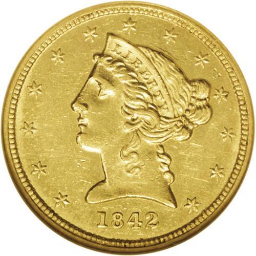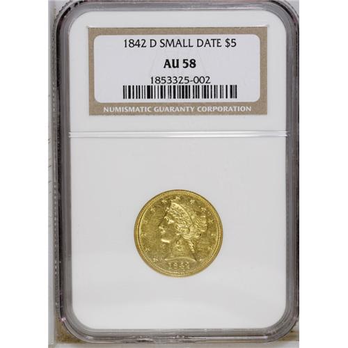 <B>1842-D $5 Small Date AU58 NGC.</B></I> Variety 8-E. The Small Date variant is the last of the previous years' date and lettering sizes. The Small Date fives were struck earlier in the year and the Large Dates later. The Small Date is the more available of the two with possibly 175-200 pieces known in all grades. At the AU58 grade level, this issue is very scarce and this piece is just outside the Condition Census. This is an atypical example of the issue as it shows a relatively strong strike throughout and it lacks the numerous, heavy marks that are commonly encountered. The bright yellow-gold surfaces show the slightest tinge of reddish patina. An important coin for the collector who needs a high grade, early D-mint five.<BR><BR><b>Shipping:</b> Coin/Currency (<a target="_blank" href="http://www.heritageauctions.com/common/shipping.php">view shipping information</a>)