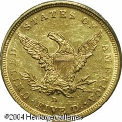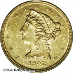 1842-D $5 Small Date AU58 PCGS. Variety 6-E, the o <B>1842-D $5 Small Date AU58 PCGS.</B></I> Variety 6-E, the only known dies. The Small Date variant is certainly the more obtainable of the two date sizes of this year, representing approximately two-thirds of the survivors known of this issue. However, in AU grades only 20-22 coins are believed extant today with this piece just outside the Condition Census. This example shows a number of small marks on each side and the surfaces overall have a pronounced yellow-gold color. Fully struck throughout, and very unusual as such. <BR><BR><B>Important notice:</B> Heritage usually auctions material at the rate of 200-250 lots per hour. On some occasions eBay Live bid software or the Internet may not be able to keep up with the pace of the auction. We recommend placing a realistic absentee bid now as insurance to avoid disappointment. Occasionally the auctioneer may eliminate or reject an eBay Live bid, and the auctioneer may also reopen a lot after the close of the eBay live bidding (usually because we missed an audience bid), and may reject your bid even if it shows you as the winning bidder. By bidding via eBay Live, you agree that Heritage may award the lot to another bidder at its sole discretion under the circumstances described above or any other reasonable circumstances. Since eBay bids are not shown to us until we open the lot on the floor, we treat those bids just like floor bids. In most cases the floor responds before the eBay bid is presented to us, due to Internet lag time, so for consistency we have made it a policy that floor bids are always considered first over tie eBay live bids. Also please note that all Heritage lots purchased through eBay Live carry a 20% Buyer's Premium. Please make sure you read the Terms and Conditions before you bid. This lot is being auctioned in conjunction with a live floor auction by Heritage Galleries & Auctioneers. All final auction and invoice information will be supplied by Heritage Galleries & Auctioneers, and all other information should be considered preliminary. Lot:6638