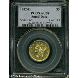 1842-D $5 Small Date AU58 PCGS. Variety 6-E, the o 1842-D $5 Small Date AU58 PCGS.