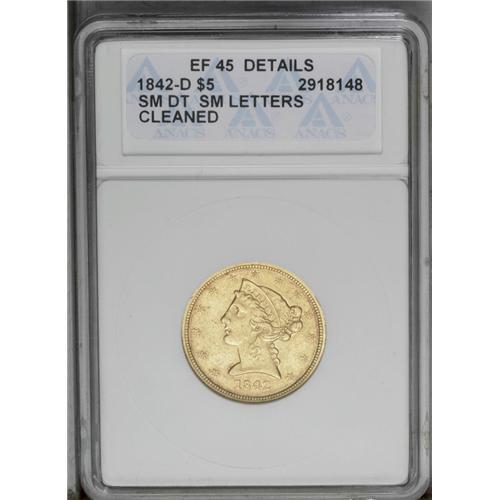 <B>1842-D $5 Small Date--Cleaned--ANACS. XF45 Details.</B></I> Variety 8-E. The more frequently seen Small Date variety of this issue is one of the more populous and affordable Dahlonega half eagles. This bright mustard-gold piece has a variety of marks and typical detail.<BR><I>From The Jones Beach Collection.</B></I><BR><BR><b>Shipping:</b> Coin/Currency (<a target="_blank" href="http://www.heritageauctions.com/common/shipping.php">view shipping information</a>)