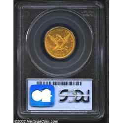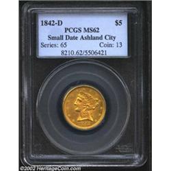 1842-D $5 Small Date MS62 PCGS. Winter 6-E. This is the second finest known Small Date 1842-D Half Eagle. This fabulous coin was formerly a part of Ed Milas' collection. When his No Motto Half Eagles were sold in 1995, it was described in part as, "Lovely, old coppery orange toning, the color gold sometimes takes on when it has aged well in a collection. Well struck for this Dahlonega Mint issue, which is often quite soft on the highpoints and the eagle's right leg...Frosty luster, a trifle subdued over the years...Norweb's was XF, the [James] Stack (1994) coin was AU, and Eliasberg's was graded AU55." None are graded higher at either of the major services (9/02).Ex: Ed Milas Collection (Stack's, 5/95), lot 445, where it brought $19,800.From the Ashland City Collection. Important notice: We expect to be auctioning lots at the rate of 200-250 per hour. Sometimes eBay Premier live bid software cannot keep up with that pace, so we strongly recommend that you place a realistic proxy bid now as insurance to avoid disappointment. Also please note that all Heritage/CAA lots purchased through eBay Premier carry a 20% Buyer's Premium. Please make sure you read the Terms and Conditions.