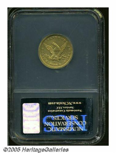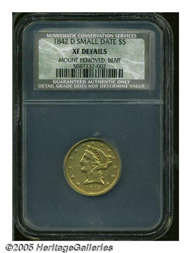 <B>1842-D<$5> Small Date XF Details, Mount Removed, Bent, NCS.</B></I> Variety 8-E. Moderately worn, for the grade, with somewhat glossy-textured surfaces that are lightly marked and have a few scattered toning spots on the obverse. The piece is slightly bent, near the rim, where a jewelry mount has been removed. While overshadowed by the much rarer Large Letters variety of this year, the Small Letters '42-D is, nevertheless, a scarce coin.
