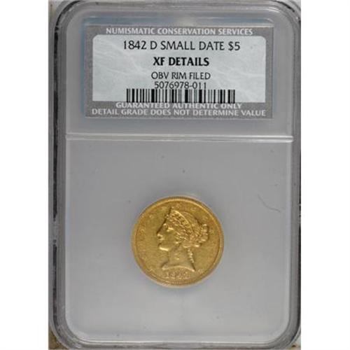 <B>1842-D $5 Small Date--Obverse Rim Filed--NCS. XF Details.</B></I> Variety 8-E. The obverse rim is filed near 6 and 9 o'clock. This Dahlonega Mint half eagle has also been cleaned, but there are no mentionable marks.<BR><BR><b>Shipping:</b> Coins & Currency (<a target="_blank" href="http://www.heritageauctions.com/common/shipping.php">view shipping information</a>)