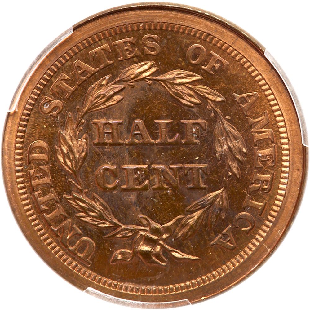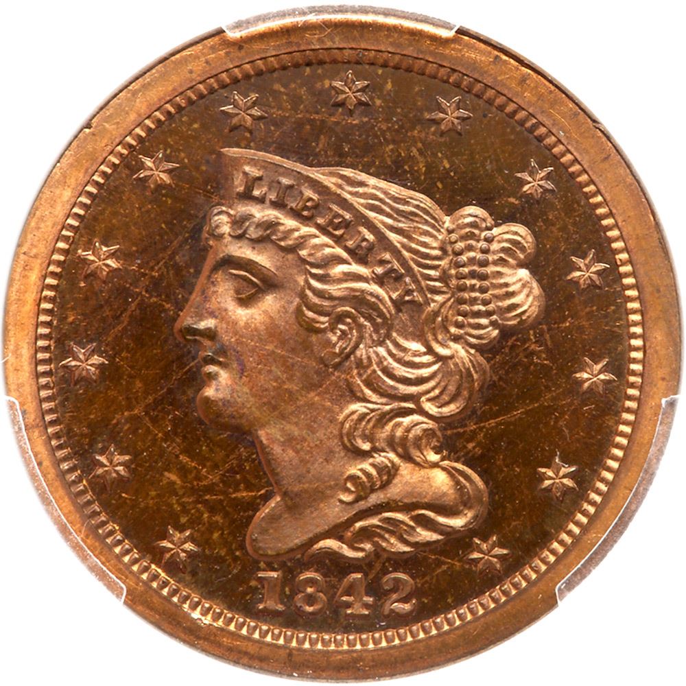 1842 First Restrike Proof Breen 1-B R6+ PCGS graded PR65 Red & Brown. Reverse of 1856. Mellowed mint red delicately fading to light bluish steel brown. The fields are very reflective with deep mirrors on both sides. Apparently both sides, especially the reverse, were repolished to deepen the mirrors before striking this piece. There are a few very faint hairlines in the obverse fields and a microscopic rim nick at star 9. A gorgeous, very impressive proof half cent. Our grade is Proof-65+, the plus for the enhanced reflectivity. Weight 77.7 grains, apparently Breens Series III. There is a wire rim from star 4 to star 10 and a similar wire rim over STATES OF AMERICA. Noyes photo #10253. The attribution is noted on the PCGS label. PCGS population 1; 1 finer in 66+RB. PCGS #35355 . Estimated Value 12,000 - UP