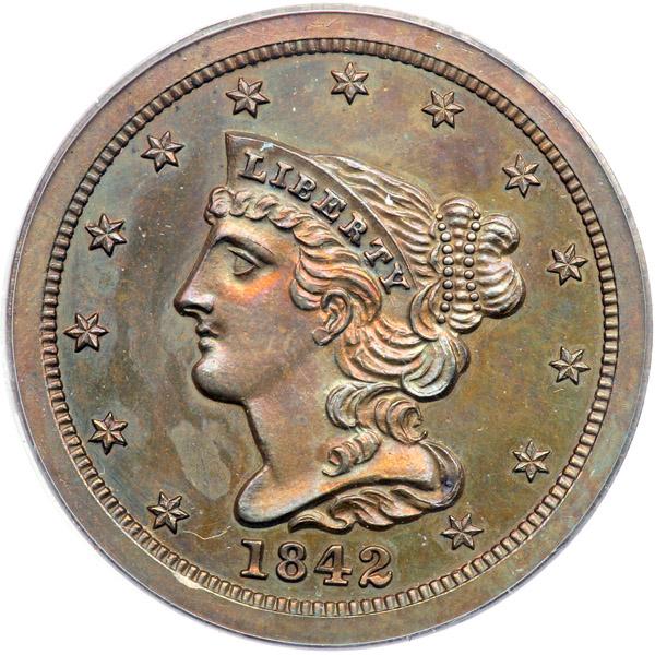 1842 First Restrike Proof Breen 1-B R6+. PCGS graded Proof 63 Brown. Golden tan and light brown with iridescent rose and bluish steel overtones on the reverse. The fields are nicely reflective with moderately deep mirrors on both sides. The notable marks are a small cloud over the bust tip, a few very faint hairlines in the obverse fields, and a very thin struck-through line from star 1 to the bust tip. Otherwise this piece is flawless. Our grade is consistent with the slab grade. PCGS population 4 with 2 in Proof-64 Brown. The attribution and Davy provenance are noted on the PCGS label. Weight 77.8 grains. Davy #42.2.2.