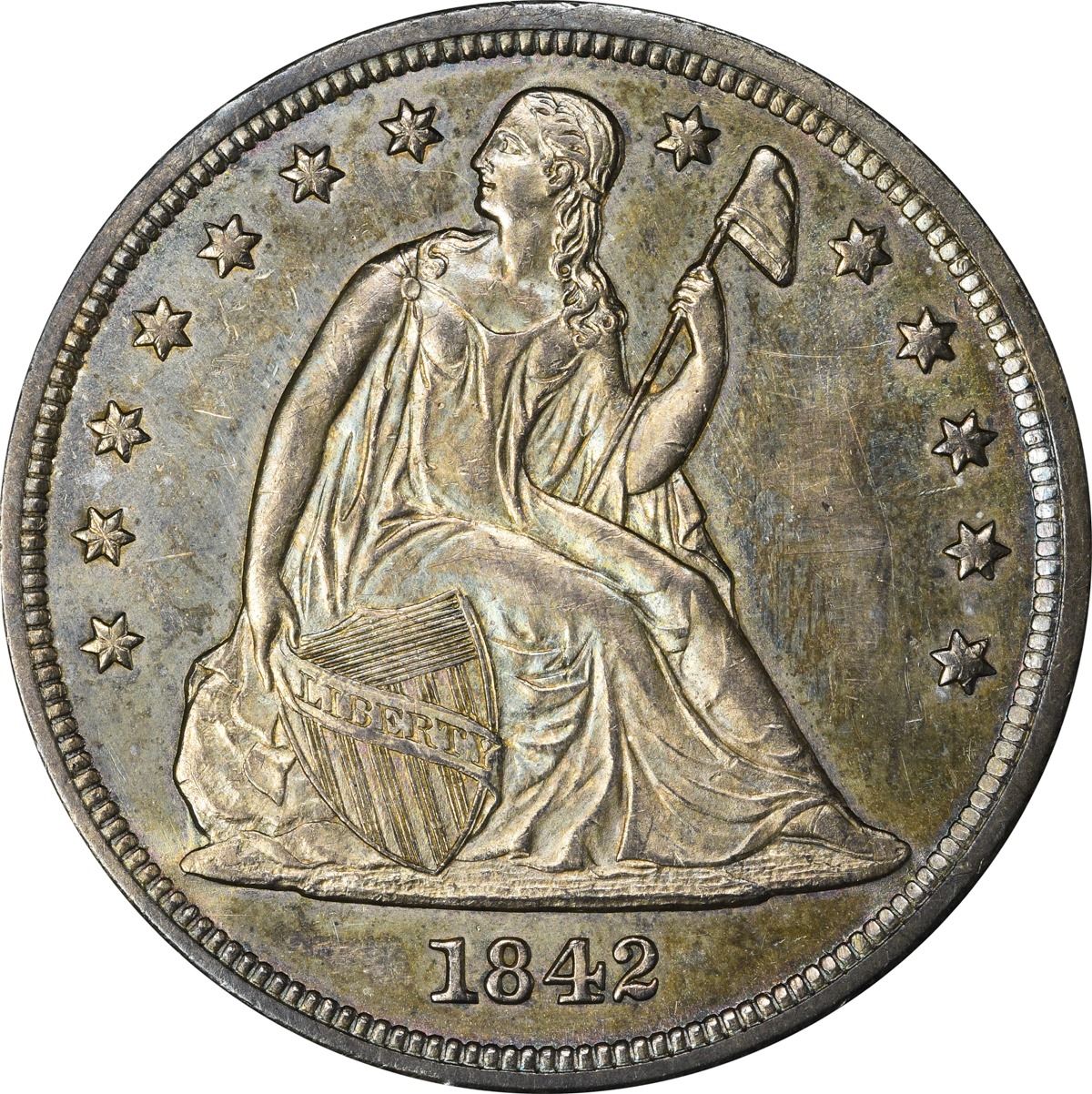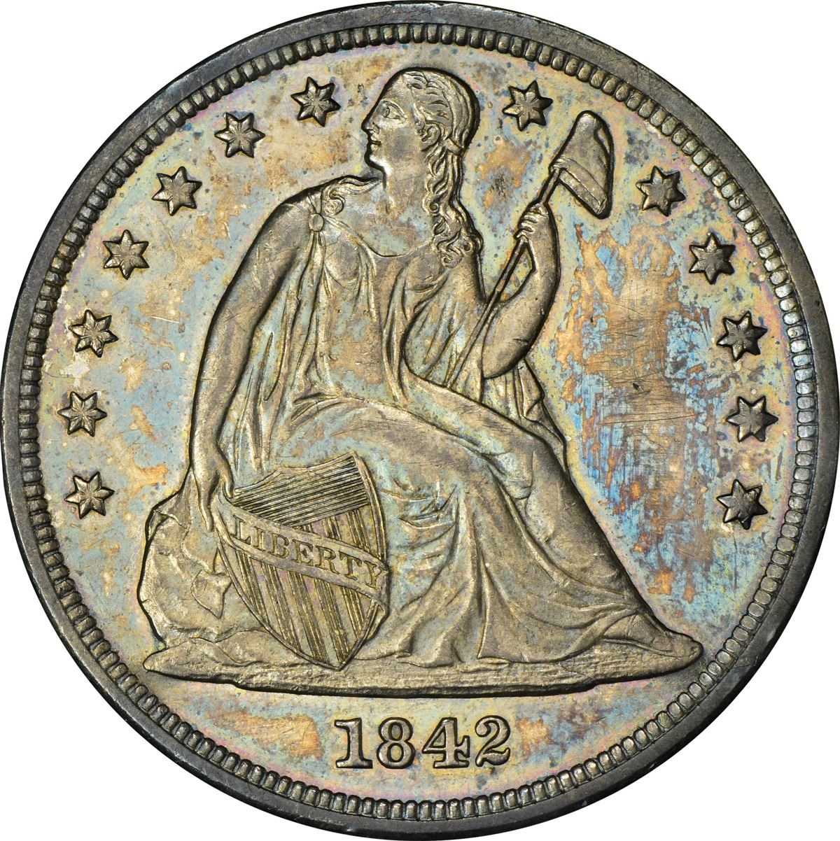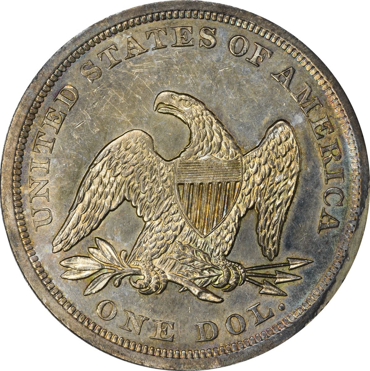 Somewhat prooflike in appearance with lively luster and a rich display of bold blue, peach, and rose iridescence available on both sides. It appears as if some graffiti has been scratched from the right obverse field, a circumstance best seen under low magnification. PCGS #6928