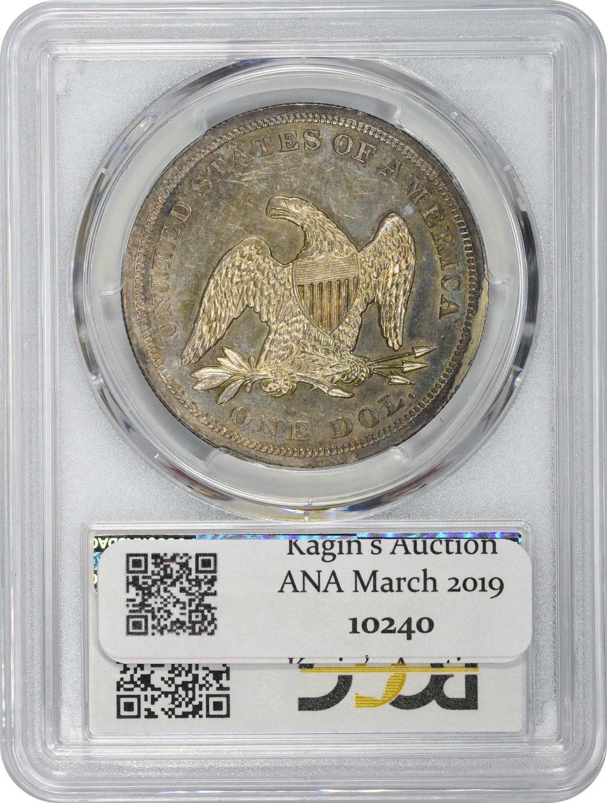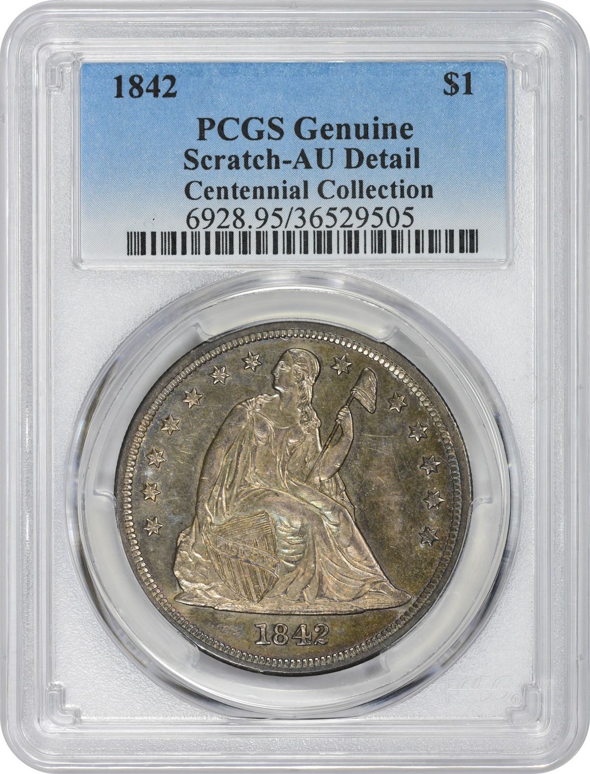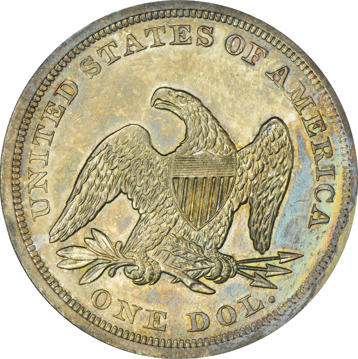 Somewhat prooflike in appearance with lively luster and a rich display of bold blue, peach, and rose iridescence available on both sides. It appears as if some graffiti has been scratched from the right obverse field, a circumstance best seen under low magnification. PCGS #6928