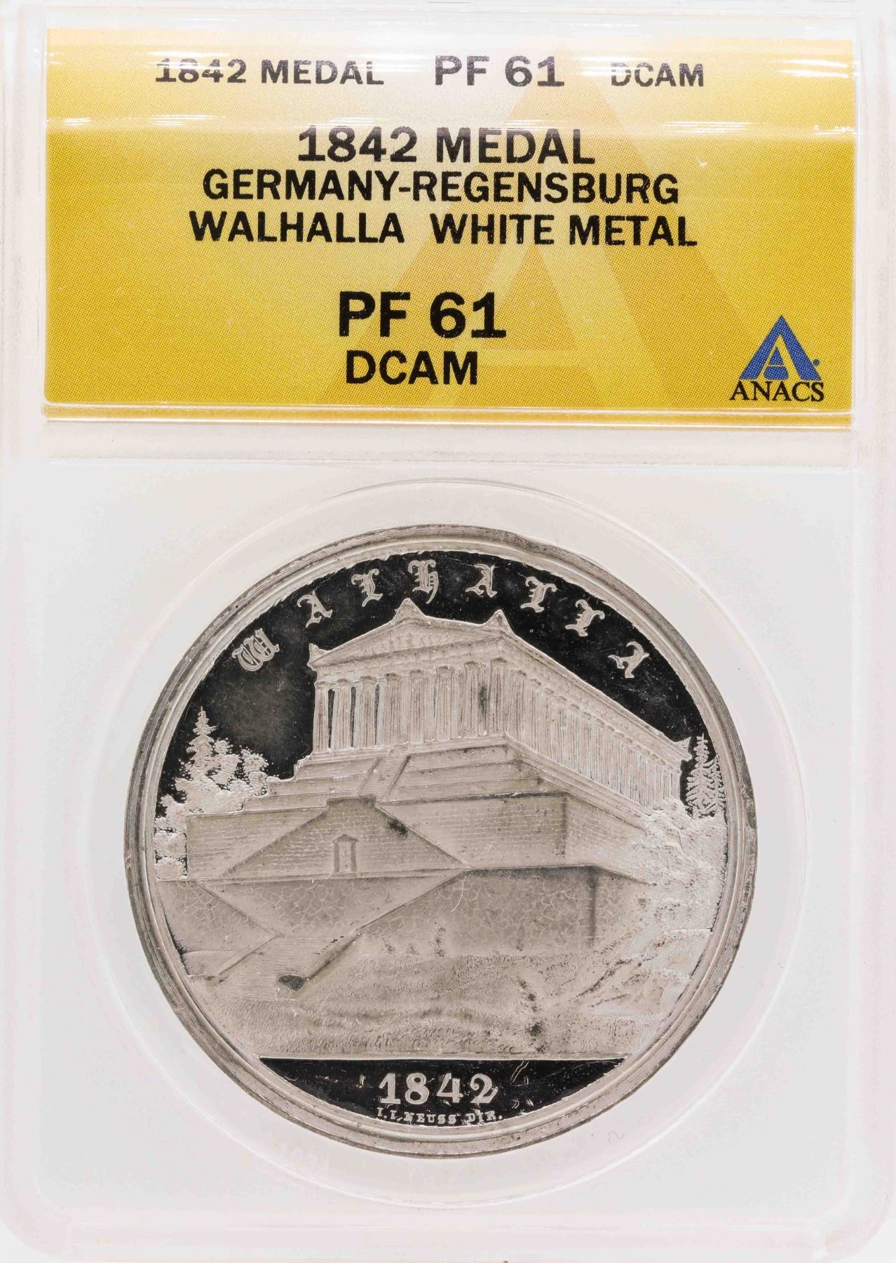 One 1842 Germany-Regensburg Walhalla White Metal Medal ANACS PF61DCAM.