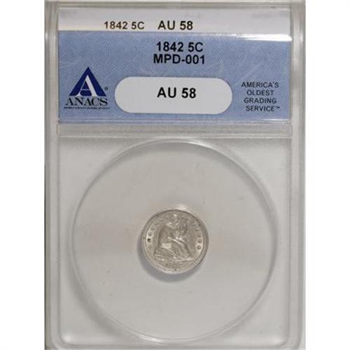 <B>1842 H10C AU58 ANACS.</B></I> MPD-001. NGC Census: (19/102). PCGS Population (12/95). Mintage: 815,000. Numismedia Wsl. Price for NGC/PCGS coin in AU58: $110. (#4330)<BR><I>From The Al Blythe Collection of Half Dimes.</B></I><BR><BR><B>Coin Engraver:</B> Christian Gobrecht<BR><BR><b>Shipping:</b> Coins & Currency (<a target="_blank" href="http://www.heritageauctions.com/common/shipping.php">view shipping information</a>)
