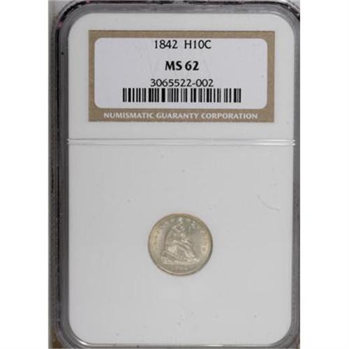<B>1842 H10C MS62 NGC.</B></I> NGC Census: (14/86). PCGS Population (16/76). Mintage: 815,000. Numismedia Wsl. Price for NGC/PCGS coin in MS62: $150. (#4330)<BR><BR><B>Coin Engraver:</B> Christian Gobrecht<BR><BR><b>Shipping:</b> Coins & Currency (<a target="_blank" href="http://www.heritageauctions.com/common/shipping.php">view shipping information</a>)