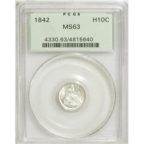 <B>1842 H10C MS63 PCGS.</B></I> PCGS Population (34/44). NGC Census: (23/63). Mintage: 815,000. Numismedia Wsl. Price for NGC/PCGS coin in MS63: $275. (#4330)<BR><BR><B>Coin Engraver:</B> Christian Gobrecht<BR><BR><b>Shipping:</b> Coins & Currency (<a target="_blank" href="http://www.heritageauctions.com/common/shipping.php">view shipping information</a>)