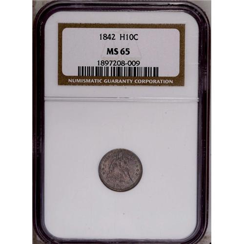 <B>1842<H10C> MS65 NGC.</B></I> Deep sky-blue and plum-gold colors bathe this shimmering and intricately struck Gem. Close scrutiny reveals only trivial contact. Rare at the MS65 level. Census: 16 in 65, 6 finer (2/06).