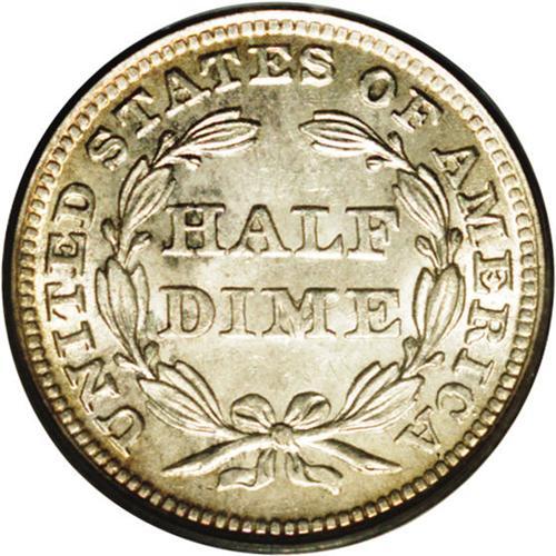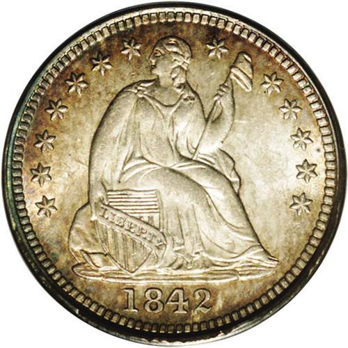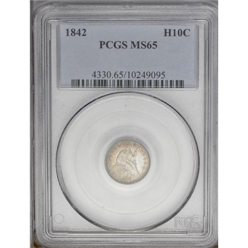 <B>1842<H10C> MS65 PCGS.</B></I> The obverse of this Gem example has light gold toning around bright silver centers. The reverse is fully brilliant with silvery-white color. A splendid quality half dime with only a few grade-consistent abrasions on either side. Population: 5 in 65, 3 finer (4/06).