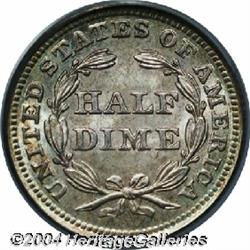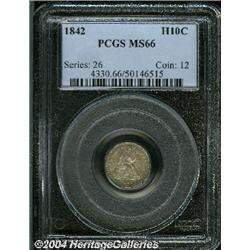 <B>1842<H10C> MS66 PCGS.</B></I> Tall Date. V-3. A delightful Gem Stars Half Dime that is well struck and shows rich, frosty luster. The gray-lilac centers change to mint-green at the rims on each side. A sharp, appealing, and almost unimprovable example of this somewhat better date. Population: 2 in 66, 0 finer (8/04). <BR><BR><B>Important notice:</B> Heritage usually auctions material at the rate of 200-250 lots per hour. On some occasions eBay Live bid software or the Internet may not be able to keep up with the pace of the auction. We recommend placing a realistic absentee bid now as insurance to avoid disappointment. Occasionally the auctioneer may eliminate or reject an eBay Live bid, and the auctioneer may also reopen a lot after the close of the eBay live bidding (usually because we missed an audience bid), and may reject your bid even if it shows you as the winning bidder. By bidding via eBay Live, you agree that Heritage may award the lot to another bidder at its sole discretion under the circumstances described above or any other reasonable circumstances. Since eBay bids are not shown to us until we open the lot on the floor, we treat those bids just like floor bids. In most cases the floor responds before the eBay bid is presented to us, due to Internet lag time, so for consistency we have made it a policy that floor bids are always considered first over tie eBay live bids. Also please note that all Heritage lots purchased through eBay Live carry a 20% Buyer's Premium. Please make sure you read the Terms and Conditions before you bid.