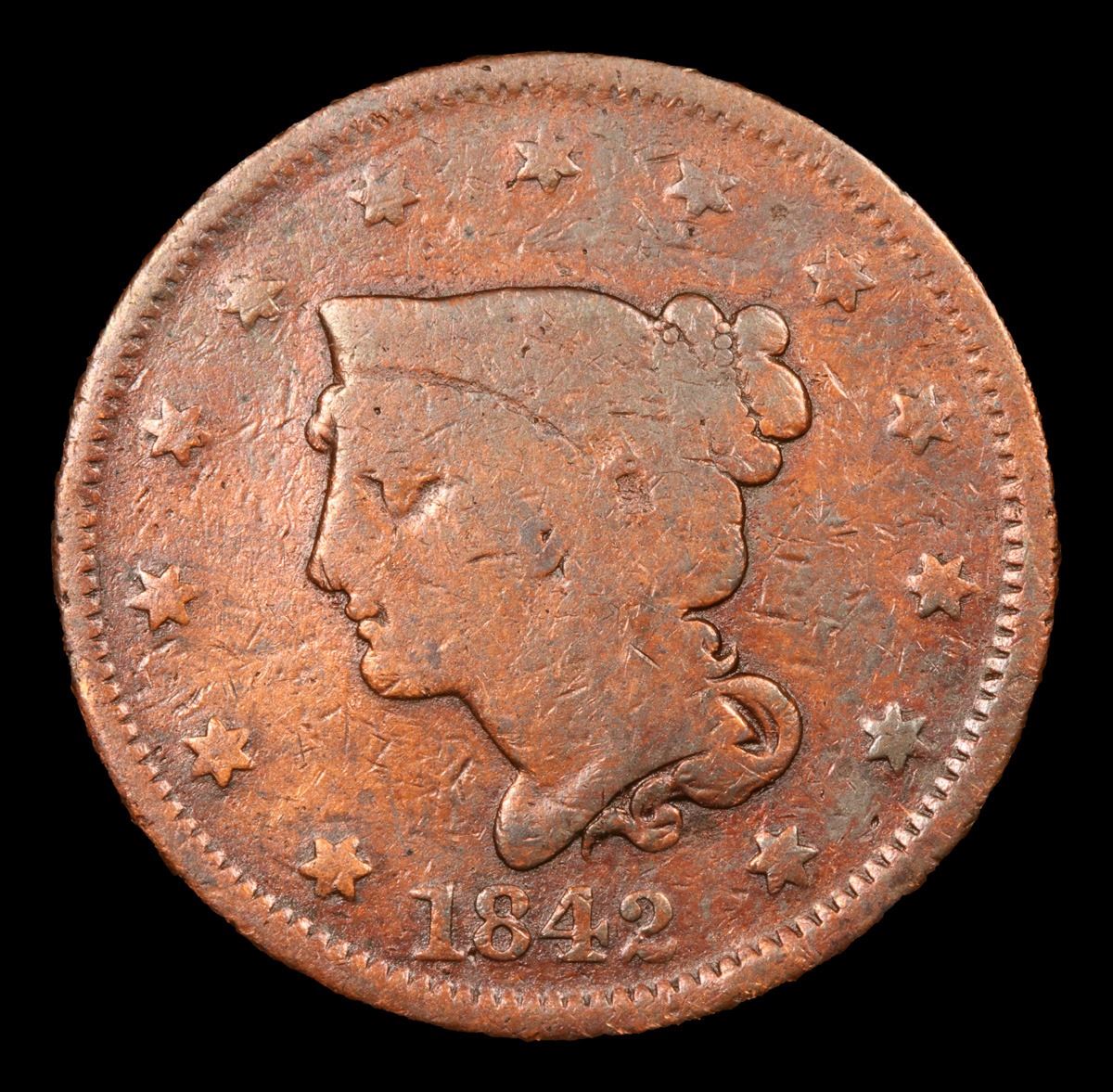 1842 Large Date Braided Hair Large Cent 1c Grades vg+.