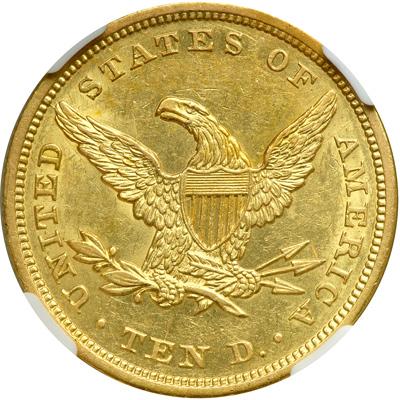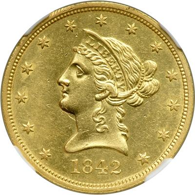1842. Large date. SS New York. NGC Shipwreck Certification graded AU-58. A pleasing untoned exzample which has some interesting fine die cracks on the reverse. Lustrous with smooth surfaces. There is a small reeding mark below the eye. Hair curls crisp and well defined, as is the eagle's plumage. Mintage: 62,884.