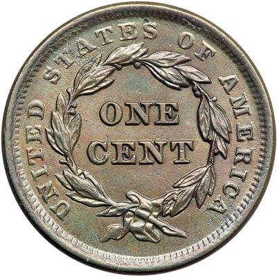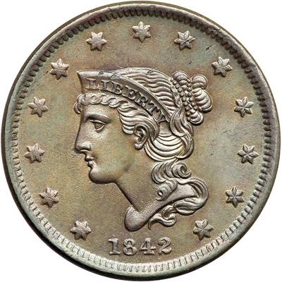 1842 N-2 R1. MS-60. Small Date. Lustrous golden light olive. Satiny and very attractive, but this piece may have been lightly dipped long ago and allowed to retone naturally. The only marks are a pair of tiny planchet flakes on the coronet over LIB and a streak of microscopic planchet flakes from TA in STATES across to CA in AMERICA, all as struck. Otherwise the surfaces are satiny and essentially flawless. LDS, die state d. The die lines and defects under the date are gone and the reverse is very lightly cracked to the bottom of the C in CENT. Tied for CC#12.
