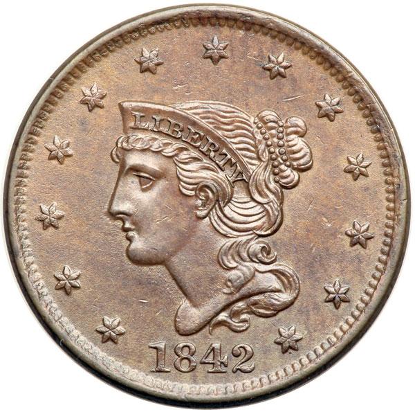 1842 N-4 R2 MS60. Glossy medium brown delicately woodgrained with frosty lighter brown. There is a small, very thin nick in the field over the outer hairbun and a small spot of darker toning (not carbon) at the dentils under the wreath ribbon. M-LDS, die state c. The point from the neck is nearly gone, only the barest hint of a nub remaining. Tied for CC#7. DWH #2018.