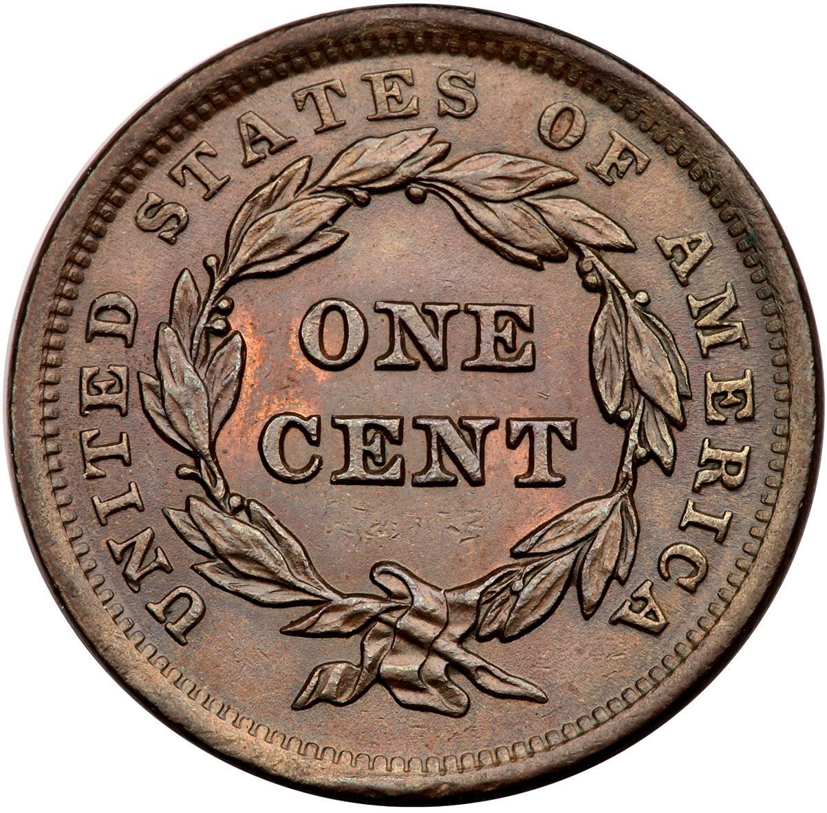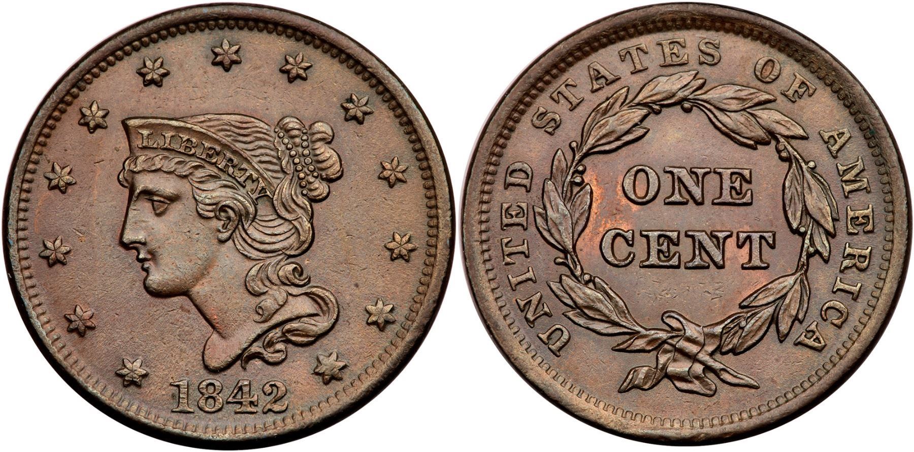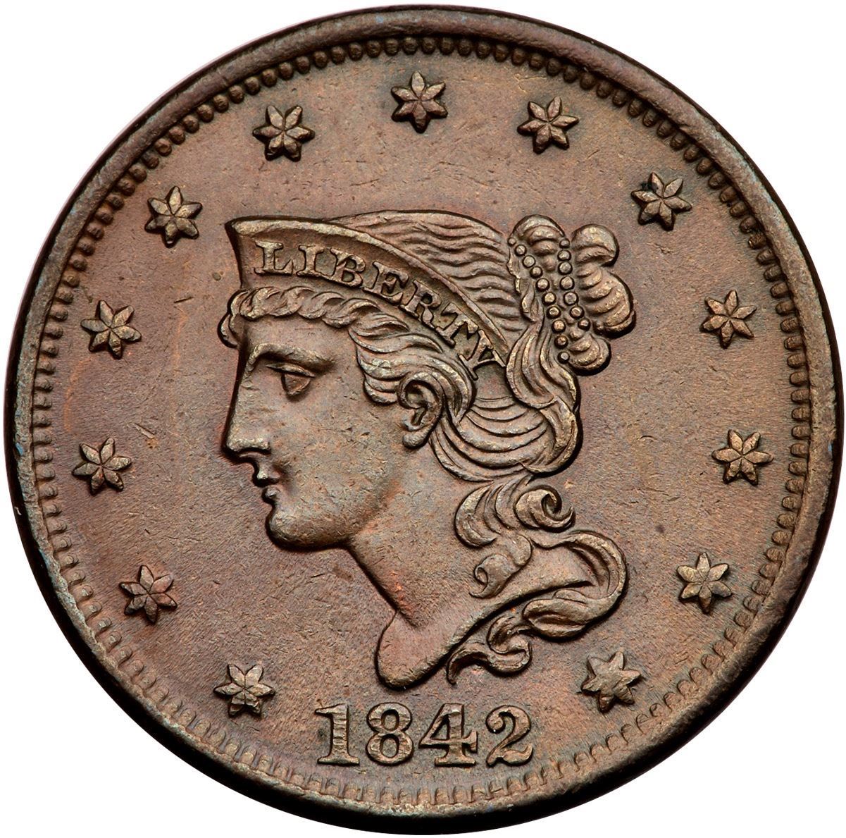1842 N-6 R-1 AU55Nicely retoned an attractive olive brown gently mottled with light brown on the portrait and with hints of underlying faded mint red. There are also various trivial marks on the portrait and fields, nothing major or distracting, and a touch of rub on the high points. Cartwheel luster covers both sides. E-MDS, die state b. Certificate Number: Pedigree: Ex; Doug Bird EAC 2012 - Buck Burgess Collection