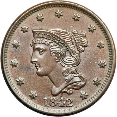 1842 N-6 R1. AU-50. Large Date. Frosty steel brown and light chocolate. Close to AU55 but there are a few microscopic contact marks on both sides, none visible without the aid of a strong glass. Excellent eye appeal. MDS, die state b late. The die lump in the field before the upper lip is weak but still visible.