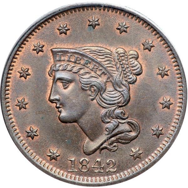 1842 N-7 R2 Large Date. PCGS graded MS-64 Brown. Very attractive lustrous olive and bluish steel brown with 10% of the mint color remaining on the obverse, 25% on the reverse. The only marks are a small spot of darker toning at the bottom of star 7 and another inside the top of the E in LIBERTY. Nicely struck MDS, die state b early. Most of the die lines at ME in AMERICA are still visible. Nicely struck for this variety. The hair details at the top of the ear are nearly full, which is quite unusual. Our grade is MS63, tied for CC#3 in the Grellman census.