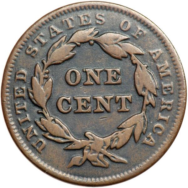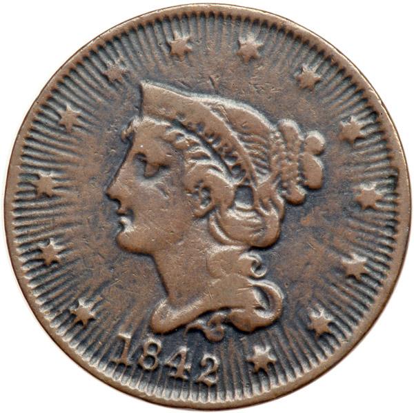 1842 N-8 R1 "Rays Obverse" VG10. This was a normal cent that was submerged in an acid solution (obverse down is my guess) and left to pickle for some time. The bath left strong radial lines covering the obverse fields creating an impressive "rays" look with the rays radiating from behind the portrait. The weight has been reduced to a very low 115.7 grains in the process. Pickling of varying degrees is sometimes found on large cents, and it is rumored cents were added purposely to the brine in pickle barrels to enhance the green color of the end product or perform some other useful service. Sounds unhealthy in many ways, but then a lot of what we did years ago clearly falls into that category based on todayÆs science. Anyway, this interesting cent is an attractive glossy medium brown with olive brown toning covering the protected areas. The rays are the lighter tone while the valleys between them are the darker olive shade, and this two-tone look really highlights the effect. The end result is a cent with real artistic qualities. DWH #2649.