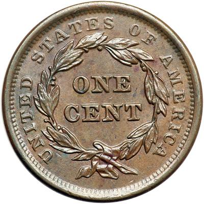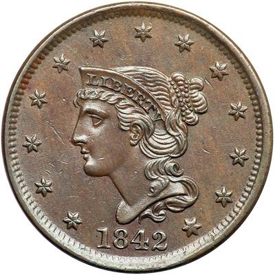 1842 N-8 R1. AU-55. Large Date. Glossy steel and light chocolate brown with satiny mint frost covering the protected areas. A very thin diagonal nick in the field off the tip of the nose and a tiny splash of reddish brown toning under the first A in AMERICA are the only notable marks. Excellent eye appeal, just a touch of very light wear on the highest points from mint state. M-LDS, die state b. The fine die lines behind ONE CENT are gone.