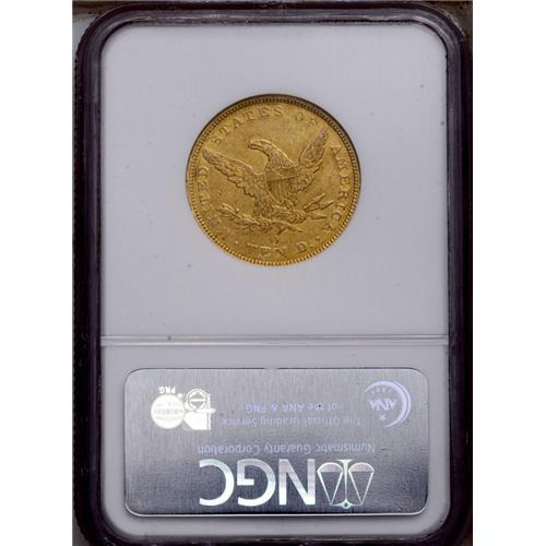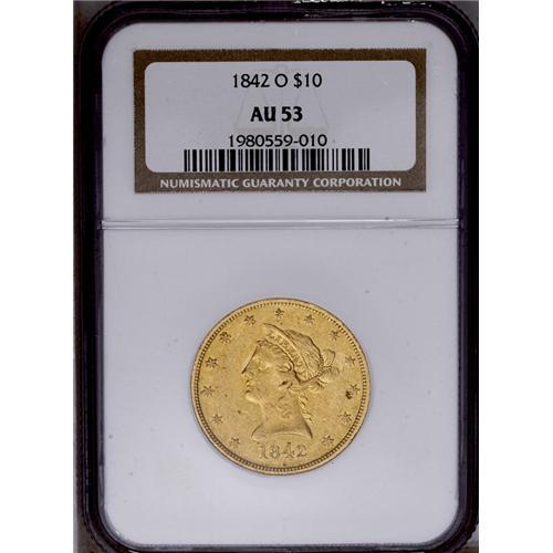 <B>1842-O<$10> AU53 NGC.</B></I> The New Orleans Mint only struck silver coins in 1838, its first year of operation. Quarter eagles were first coined at the facility in 1839, and the half eagle was initially struck there in 1840. O-mint eagles followed in 1841, but that issue is very rare. Although scarce, the 1842-O is the first readily collected New Orleans eagle. The present lemon-gold piece has its share of small to moderate marks. However, luster is plentiful, and the sharpness is impressive for the issue.