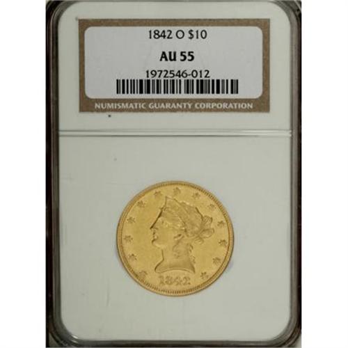 <B>1842-O $10 AU55 NGC.</B></I> Round O. The 1842-O is midway in rarity between the nearly uncollectible 1841-O and the relatively plentiful 1843-O. The 1842-O is scarce in all grades. Most certified examples are in XF and AU, and NGC has certified only three pieces as Mint State, one each between MS60 and MS62. This partly lustrous and crisply struck piece is slightly bright but lacks mentionable marks. Census: 20 in 55, 21 finer (1/08).<BR><BR><B>Coin Engraver:</B> Christian Gobrecht<BR><BR><b>Shipping:</b> Coins & Currency (<a target="_blank" href="http://www.heritageauctions.com/common/shipping.php">view shipping information</a>)