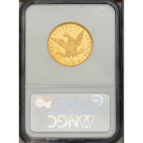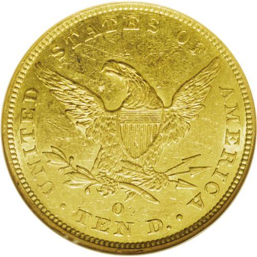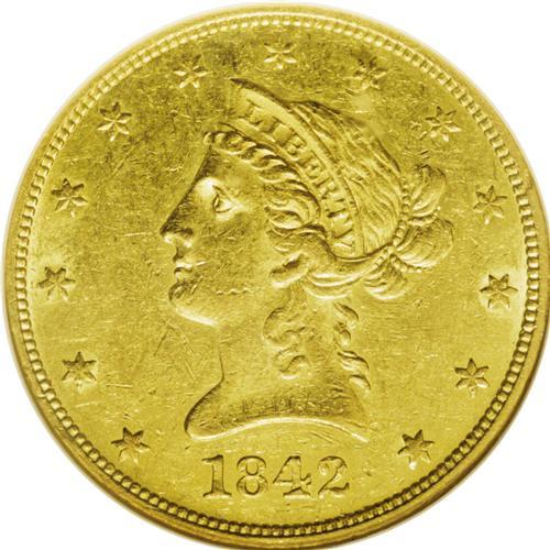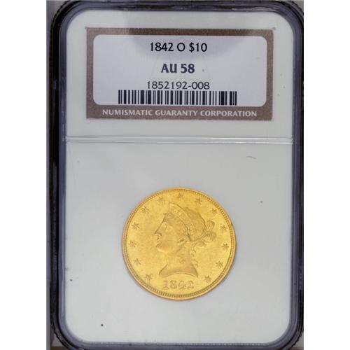 <B>1842-O<$10> AU58 NGC.</B></I> Some residual luster is still evident with a nice strike and numerous small and medium sized marks as one might expect of an AU specimen of this early New Orleans emission. Each side has mellowed to a soft green-gold color. A couple of mentionable abrasions are reported: one on Liberty's cheek, the other under the eagle's left (facing) wing, these being mentioned for future pedigree purposes. The 1842-O is a difficult early New Orleans ten and very scarce at the AU58 level. NGC and PCGS combined report only 18 coins in AU58 with just four finer (7/06).