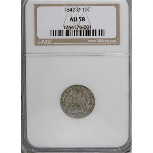 <B>1842-O 10C AU58 NGC.</B></I> Despite a mintage of just over 2 million pieces, the 1842-O dime proves elusive in better circulated grades. This near-Mint example, luminous beneath rich silver-gray and sage patina, is well struck with few flaws and only minor highpoint friction.<BR><BR><B>Coin Engraver:</B> Christian Gobrecht<BR><BR><b>Shipping:</b> Coins & Currency (<a target="_blank" href="http://www.heritageauctions.com/common/shipping.php">view shipping information</a>)