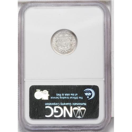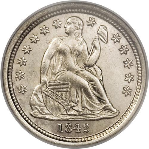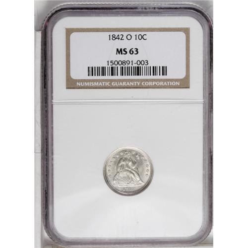 <B>1842-O<10C> MS63 NGC.</B></I> Fortin-101. The Medium O mintmark was entered at an angle, and is heavy at the top and light at the base. A suitably struck and nearly untoned example with gentle satin luster and no reportable marks. Despite a mintage of 2,020,000 pieces, the 1842-O is rare in AU and better grades. Census: 5 in 63, 7 finer (2/06).