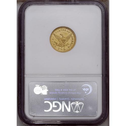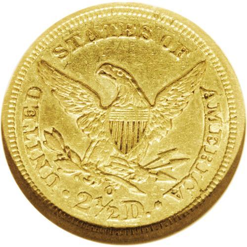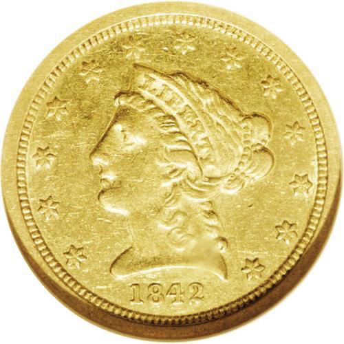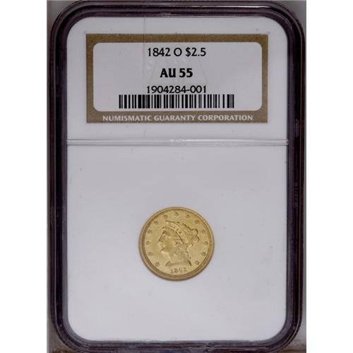 <B>1842-O $2 1/2 AU55 NGC.</B></I> Very scarce in all grades and much rarer than the mintage of 19,800 pieces would indicate. Akers rated this difficult O-mint as having the ninth lowest average grade in the series. When encountered, a minimally worn '42-O is almost invariably poorly defined in the centers, not the case with this partially lustrous yellow-gold example. Only a faint diagonal mark near the eagle's beak detracts at all from this elusive Choice AU specimen.